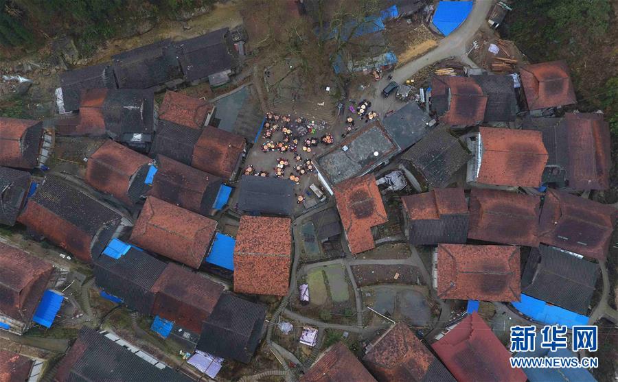 乌英苗寨的百家宴(2月13日无人机拍摄)。 新华社记者 黄孝邦 摄