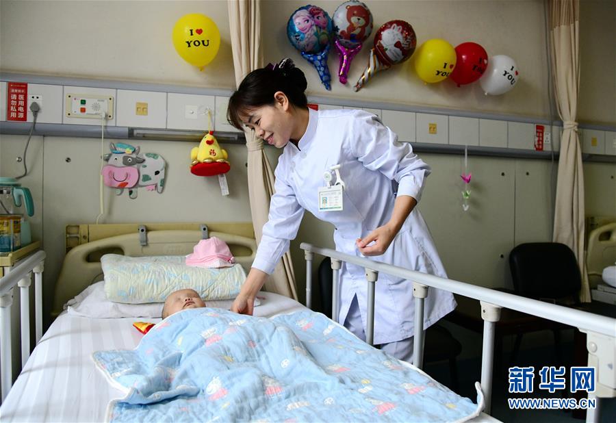 2月14日,护士在病房护理接受肝移植手术的婴儿囡囡。 1月23日,在西安交通大学第一附属医院,经过医护团队7个小时的手术,6个月大的试管婴儿囡囡的病肝被切除,成功移植母亲捐献的260.4克健康肝脏。经过20多天的精心护理,婴儿囡囡于2月14日康复出院。 新华社记者 李一博 摄