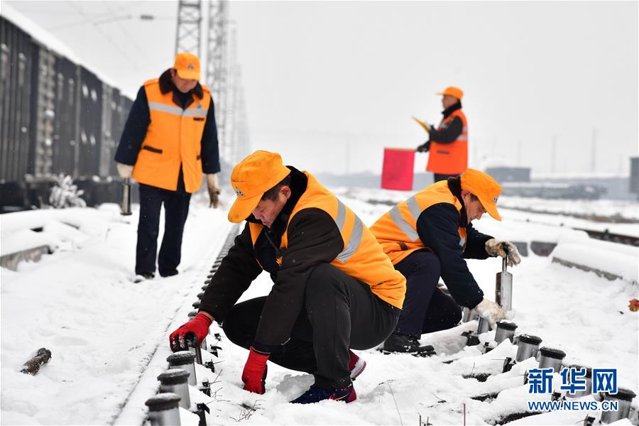 2月14日,在河南省焦作市博爱县月山镇月山车站编组场,铁路工人进行更换减速顶作业。新华社记者 冯大鹏 摄