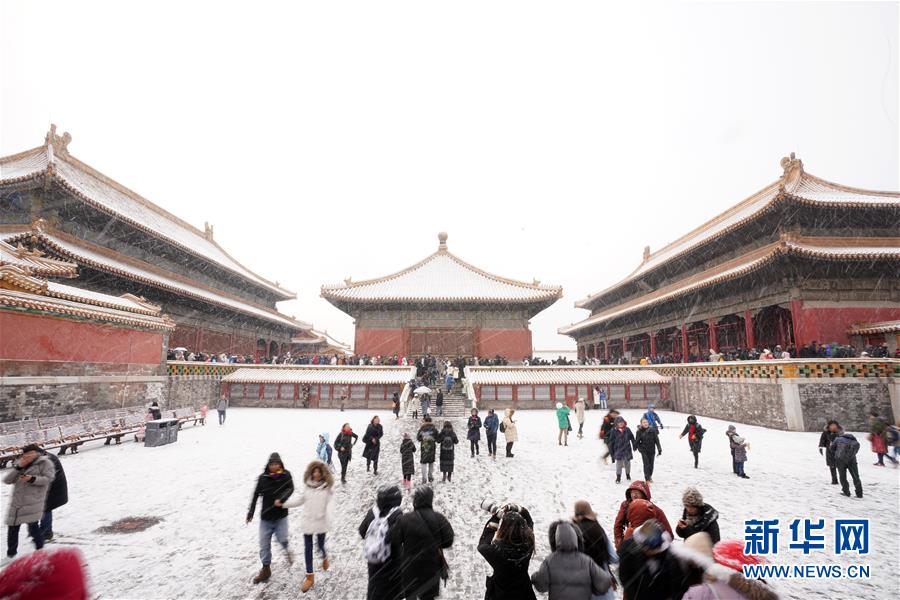 2月14日,游客在雪中游览北京故宫。 当日,北京降雪,大批游人来到故宫游览赏雪。 新华社记者 鞠焕宗 摄