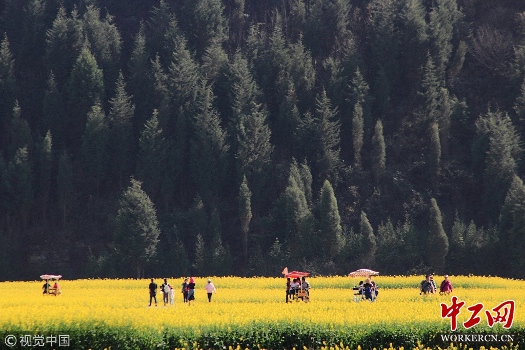 2019年2月14日,来自全国各地的成千上万游客们,纷纷赶到云南省曲靖市罗平县欣赏20多万亩油菜花形成的花海美景,拍照留影。