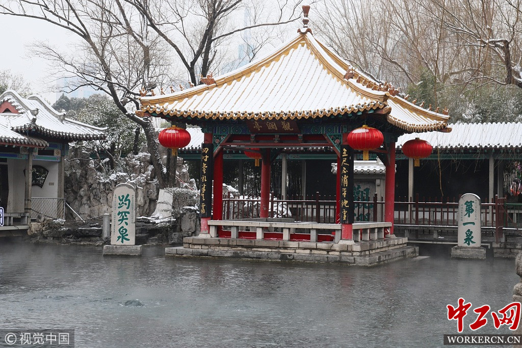 2019年2月14日,济南,由于趵突泉泉水高于室外温度,三股泉水处热气云雾缭绕如开水壶,吸引不少市民驻足拍照观看。