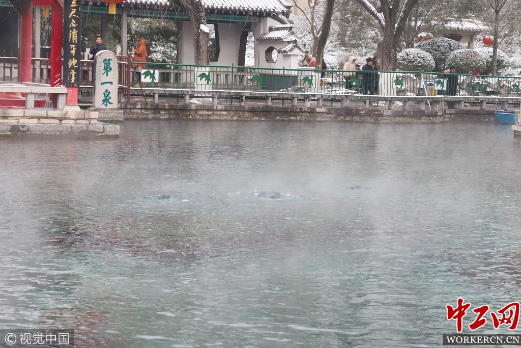 2019年2月14日,济南,由于趵突泉泉水高于室外温度,三股泉水处热气云雾缭绕如开水壶,吸引不少市民驻足拍照观看。
