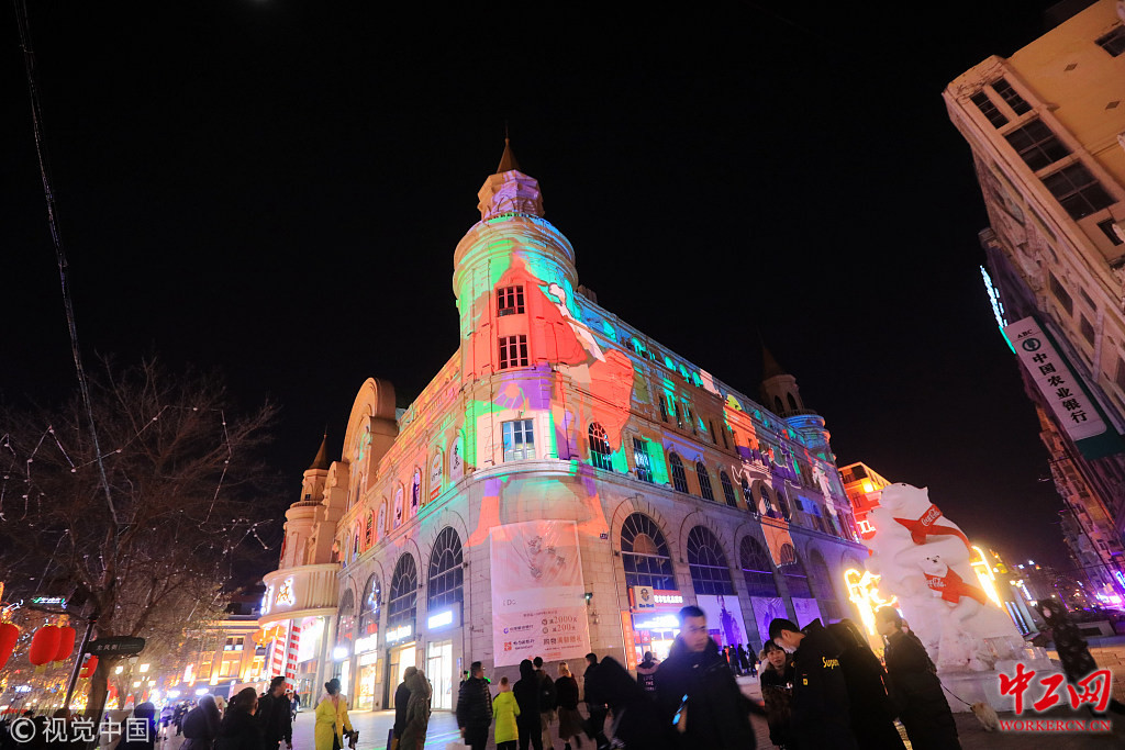 哈尔滨上演3D灯光秀 展示中央大街欧陆风情