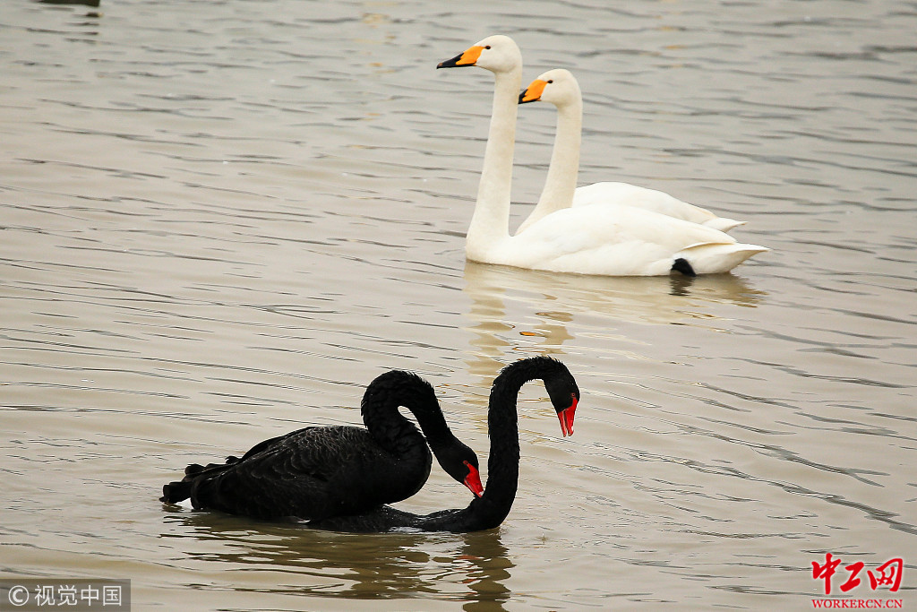 河南三门峡:“黑白双煞”天鹅湖中齐戏水