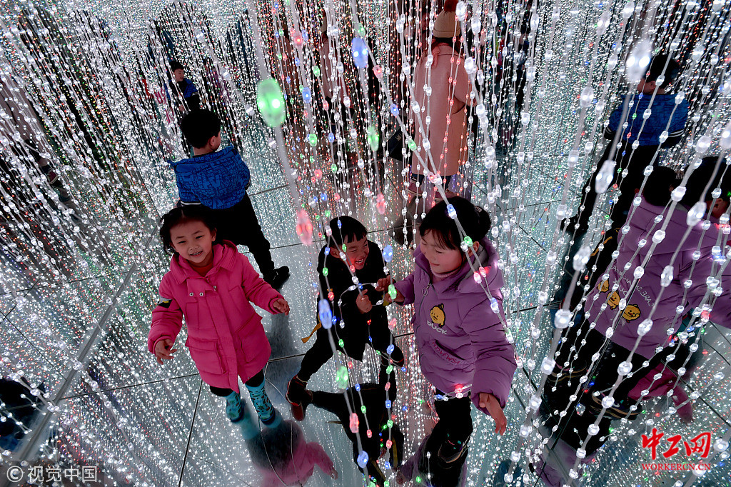 2019年2月14日,扬州市寒假里的孩子们正在“科技灯彩”互动体验艺术空间内,尽享时尚“花灯”光影盛宴。