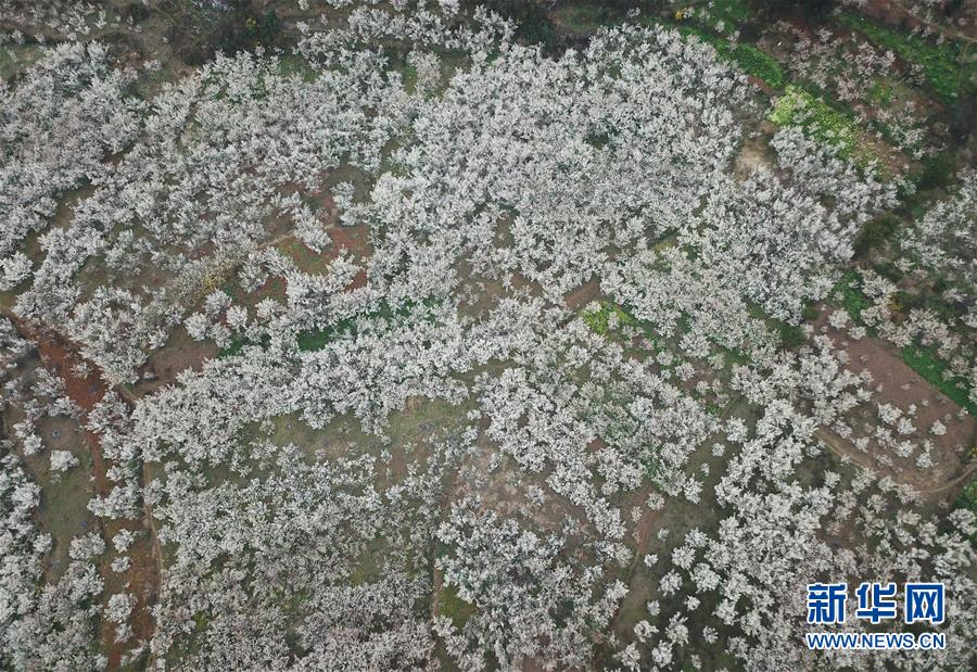 这是2月15日拍摄的大方县猫场镇的樱桃花(无人机拍摄)。新华社发(罗大富 摄)