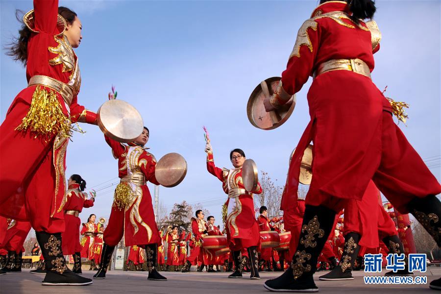 2月16日,锣鼓队在临汾市襄汾县丁陶文化广场表演。新华社发(李现俊 摄)