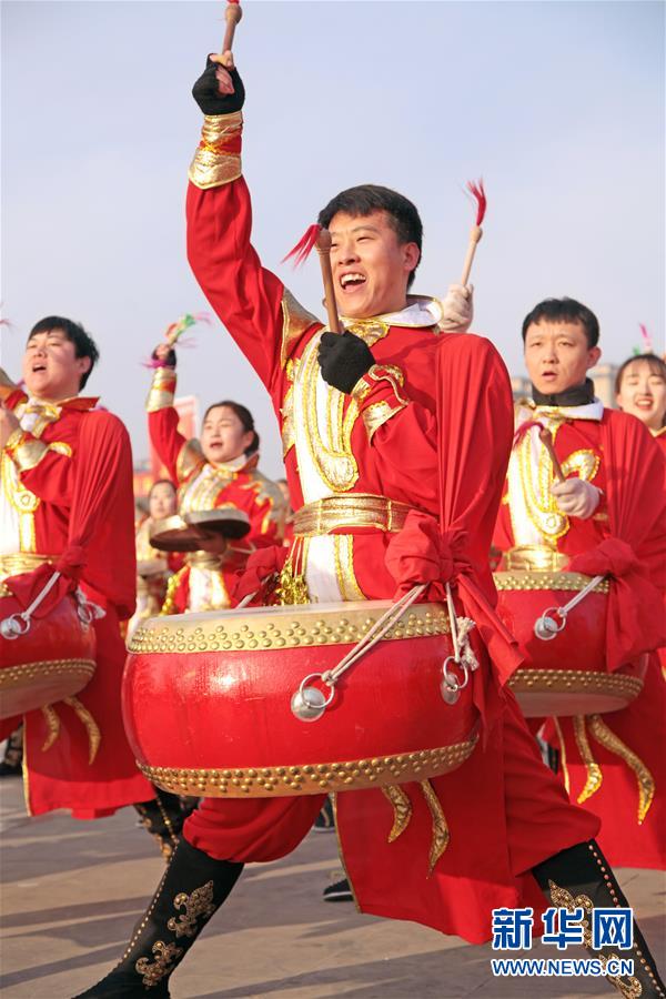 2月16日,锣鼓队在临汾市襄汾县丁陶文化广场表演。新华社发(李现俊 摄)