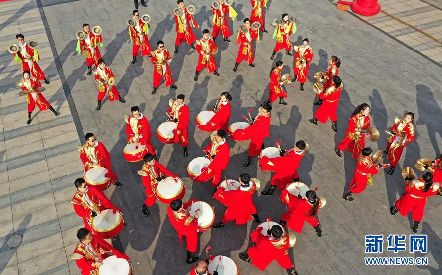 2月16日,锣鼓队在临汾市襄汾县丁陶文化广场表演(无人机拍摄)。新华社发(李现俊 摄)