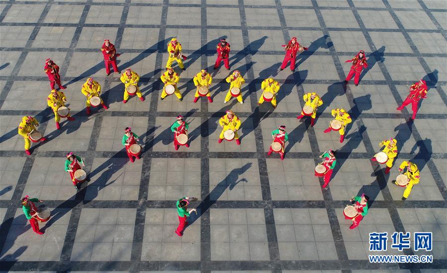 2月15日,河北内丘县的乡村锣鼓队在文化惠民展演中表演(无人机拍摄)。新华社发(石晓鹏 摄)