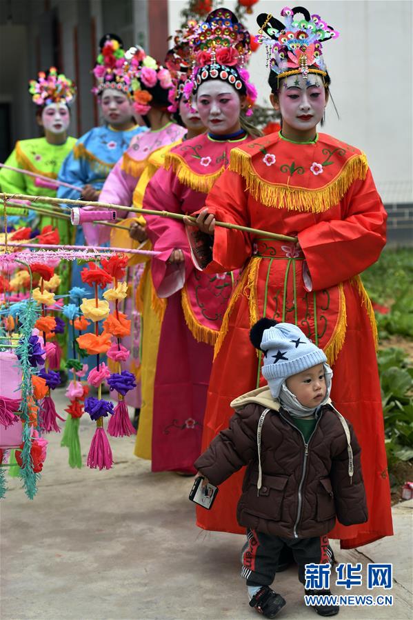 2月16日,在甘肃省陇南市文县玉垒乡玉垒坪村,花灯戏艺人准备在村内巡游。 玉垒花灯戏是甘肃省的非遗传统戏曲剧种之一。元宵节将至,文县玉垒乡各村的花灯戏艺人来到玉垒坪村进行交流展演,并在村内进行巡游,喜迎元宵佳节。 新华社发(冉创昌 摄)