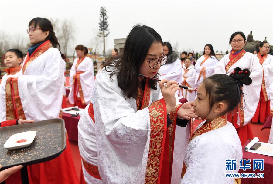2月16日,在西安汉城湖开笔礼“朱砂开智”环节,家长为学童额头点朱砂。 当日,西安百余名学童在西安汉城湖举行汉服开笔礼,通过“朱砂开智”“击鼓鸣智”“启蒙描红”等仪式体验中国古代传统文化。 新华社记者 刘潇 摄