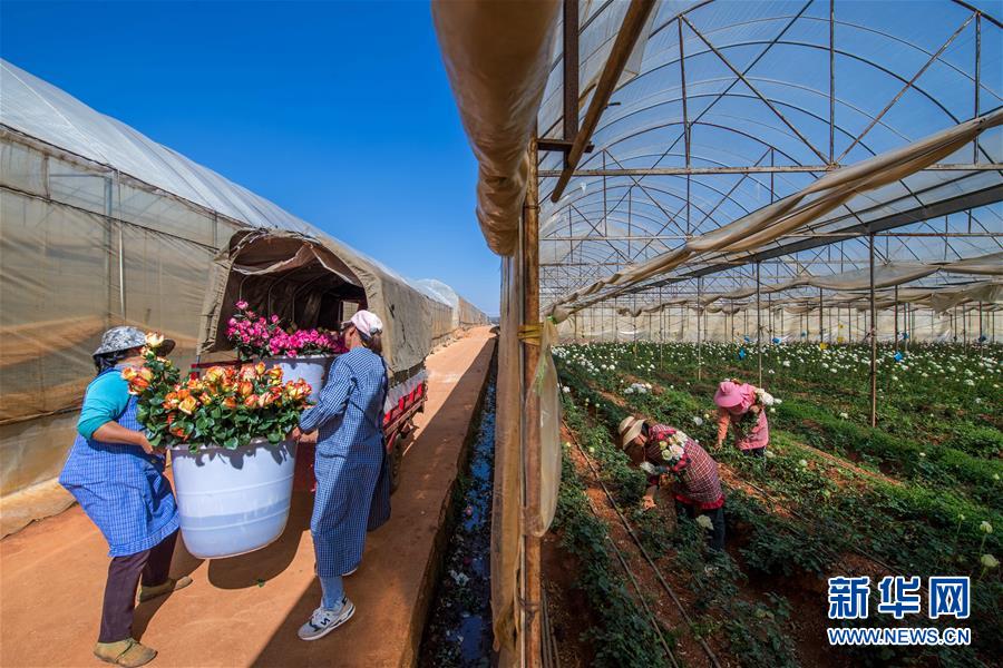 2月15日,在中国云南石林彝族自治县锦苑花卉产业园,花农采摘和搬运鲜花。 新华社记者 胡超 摄