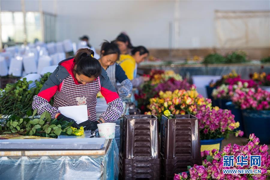 2月14日,在中国云南石林彝族自治县锦苑花卉产业园,工作人员对鲜花进行包装。 新华社记者 江文耀 摄