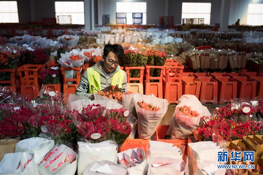 2月12日,在中国云南昆明斗南国际花卉拍卖交易中心,一名质检员对鲜花进行质量检验及等级评定。 新华社记者 江文耀 摄