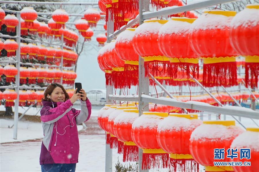 2月19日,市民在山东省烟台市莱山区拍摄雪景。 当日是正月十五元宵节,部分地区迎来降雪。雪花覆盖在大红灯笼上,为节日增添别样情趣。 新华社发(唐克 摄)