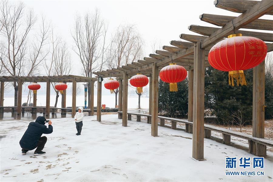 2月19日,在河北省唐山市滦南县北河公园,游人在雪地里拍照。 当日是正月十五元宵节,部分地区迎来降雪。雪花覆盖在大红灯笼上,为节日增添别样情趣。 新华社发(张永新 摄)