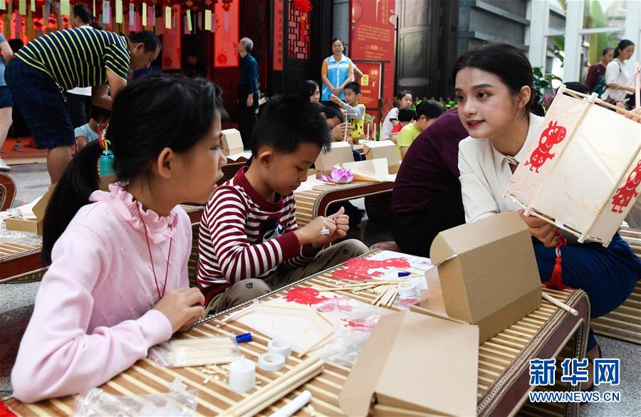 2月19日,在海南省博物馆,工作人员在为小朋友讲解如何制作花灯。新华社记者杨冠宇摄