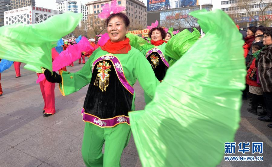 2月19日,在黑龙江省牡丹江市北山广场,民间艺人在表演传统秧歌。新华社发(张春祥 摄)