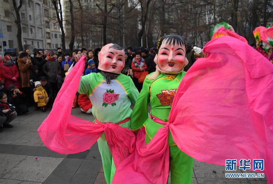 2月19日,在黑龙江省牡丹江市元宵节秧歌展演现场,民间艺人在进行民俗表演。新华社发(陈占辉 摄)