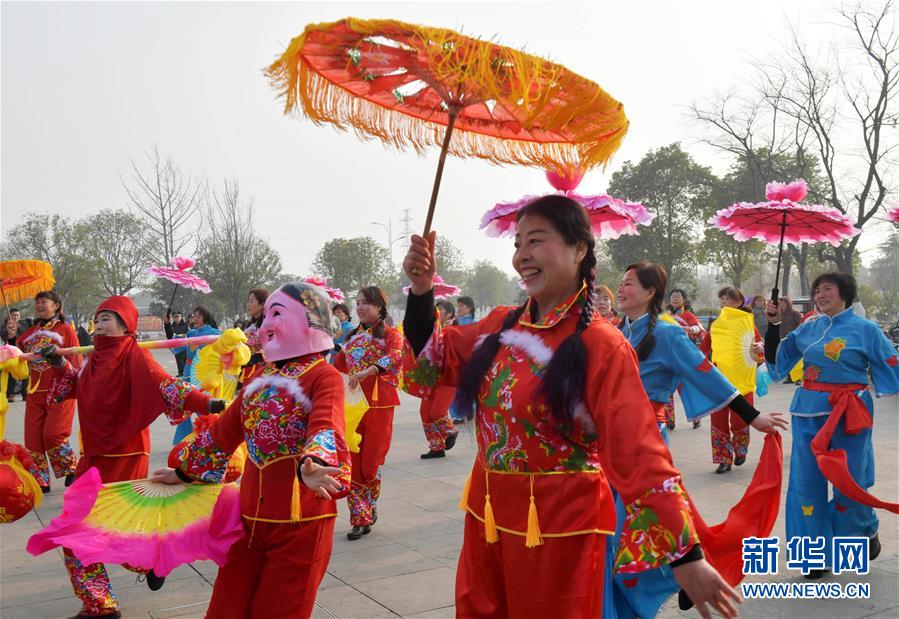 2月19日,在湖北省襄阳市襄城区,民间文艺队在进行民俗表演。新华社发(安富斌 摄)
