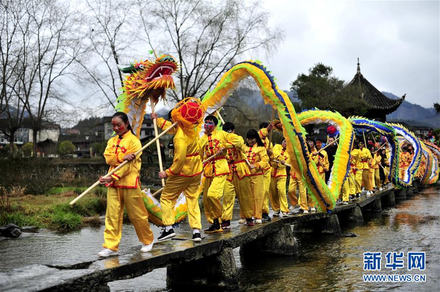 2月19日,在贵州黔东南苗族侗族自治州锦屏县隆里古城,一支舞龙队在乡间巡游。 新华社发(梁光源 摄)