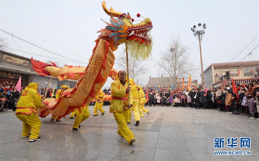2月19日,民间艺人在河北邯郸市丛台区黄粱梦镇袁庄村表演舞龙。 新华社发(郝群英 摄)