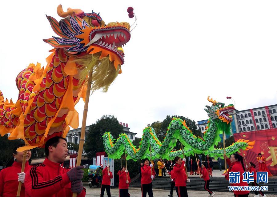 2月19日,在江西省万载县,民间艺人在表演舞龙。新华社发(邓龙华 摄)