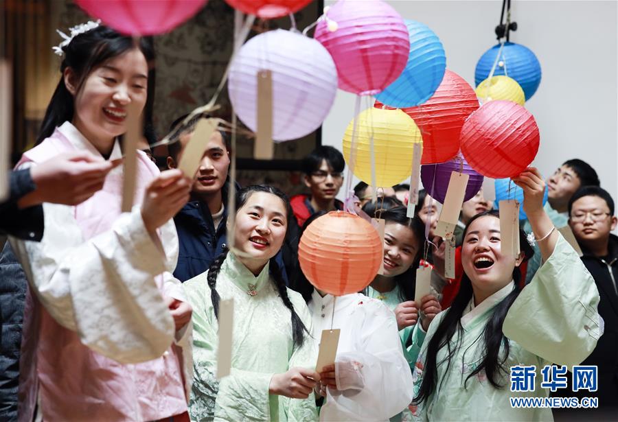 2月19日,重庆市首家青年人才驿站的青年人才和志愿者们身着汉服,在驿站内猜灯谜。 新华社记者 刘潺 摄