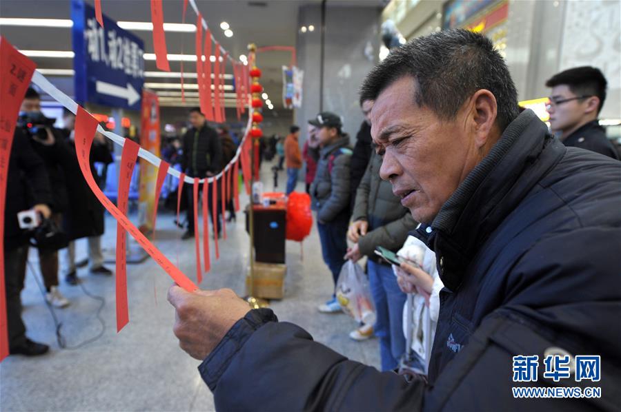 2月19日,旅客在武汉市武昌火车站内猜灯谜。新华社发(彭琦 摄)