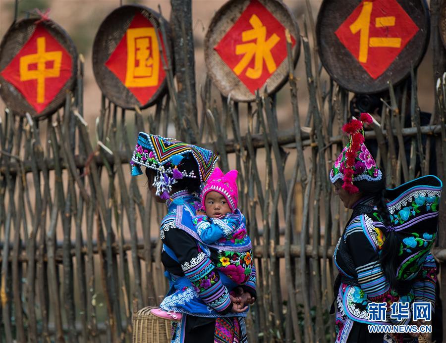 2月19日,妇女带着孩子前来参加赛装节。 新华社记者江文耀摄
