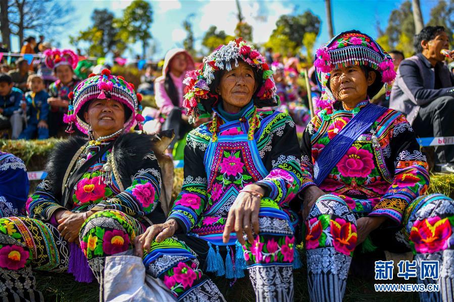 2月19日,观看赛装节表演的村民身着盛装。 新华社记者江文耀摄