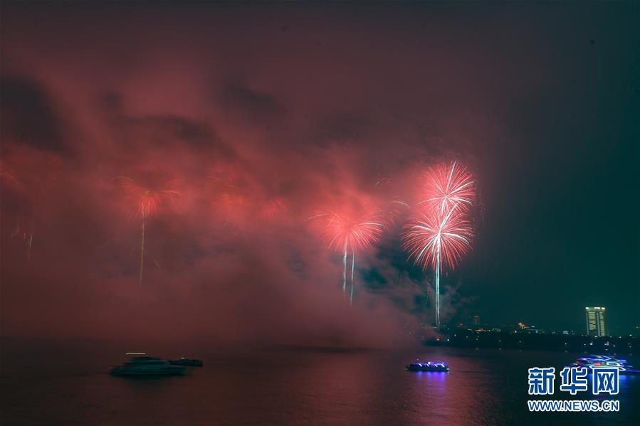 2月19日,湖南长沙橘子洲上空绽放绚丽焰火。 当晚,多地举行焰火晚会,欢庆元宵佳节。 新华社发(陈泽国 摄)