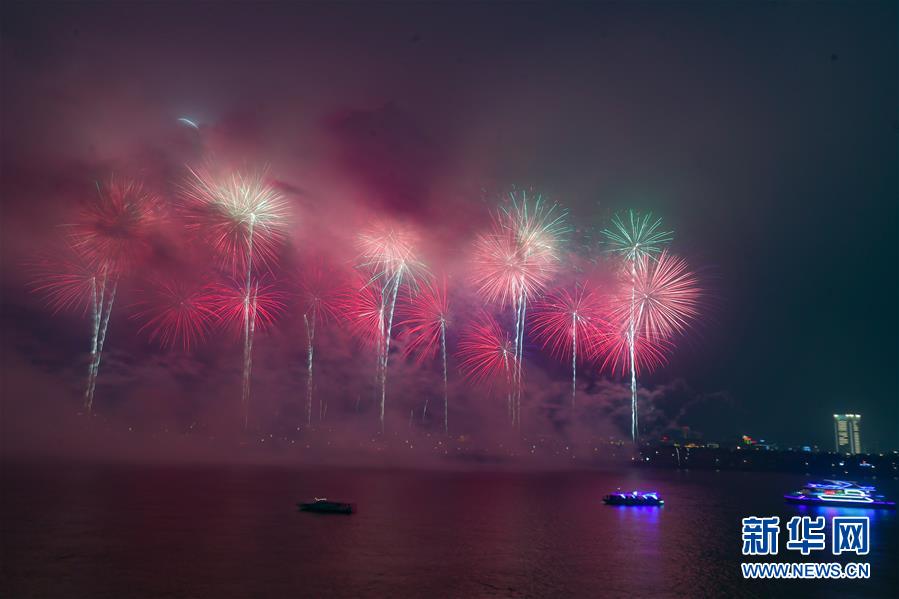 2月19日,湖南长沙橘子洲上空绽放绚丽焰火。 当晚,多地举行焰火晚会,欢庆元宵佳节。 新华社发(陈泽国 摄)