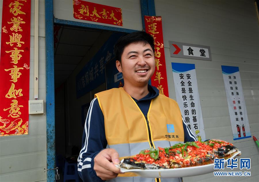 2月19日,工人们在中建三局三公司厦门城市综合体建筑工地“共享厨房”品尝各自制作的拿手家乡菜,以聚餐的形式欢度元宵节。 新华社记者张国俊摄