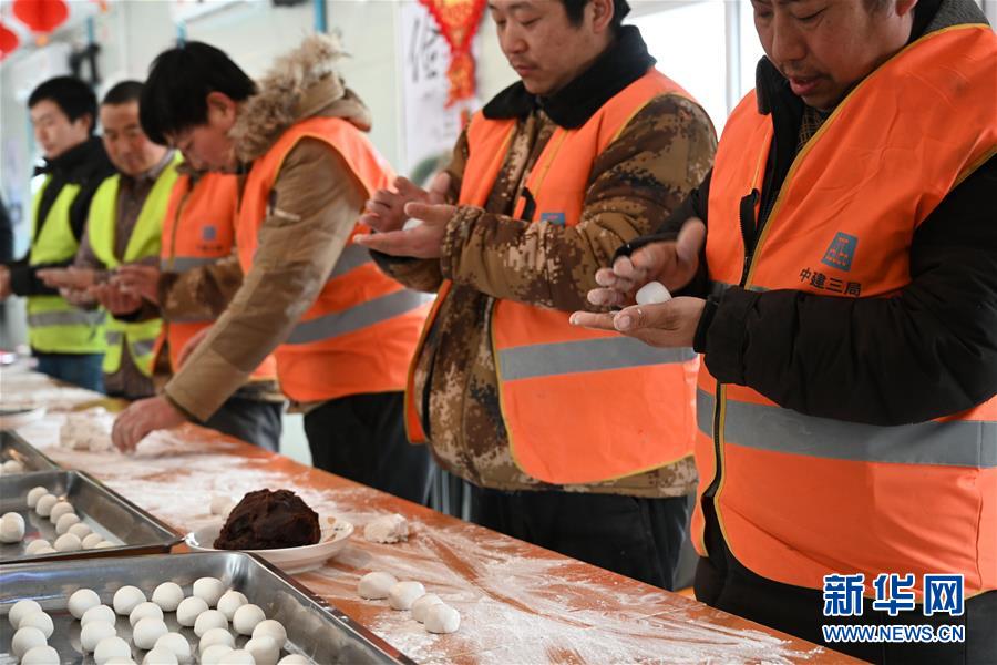 2月19日,中建三局三公司北京大兴国际机场项目一名员工在宿舍外吃汤圆,庆祝元宵节。 新华社记者金良快摄