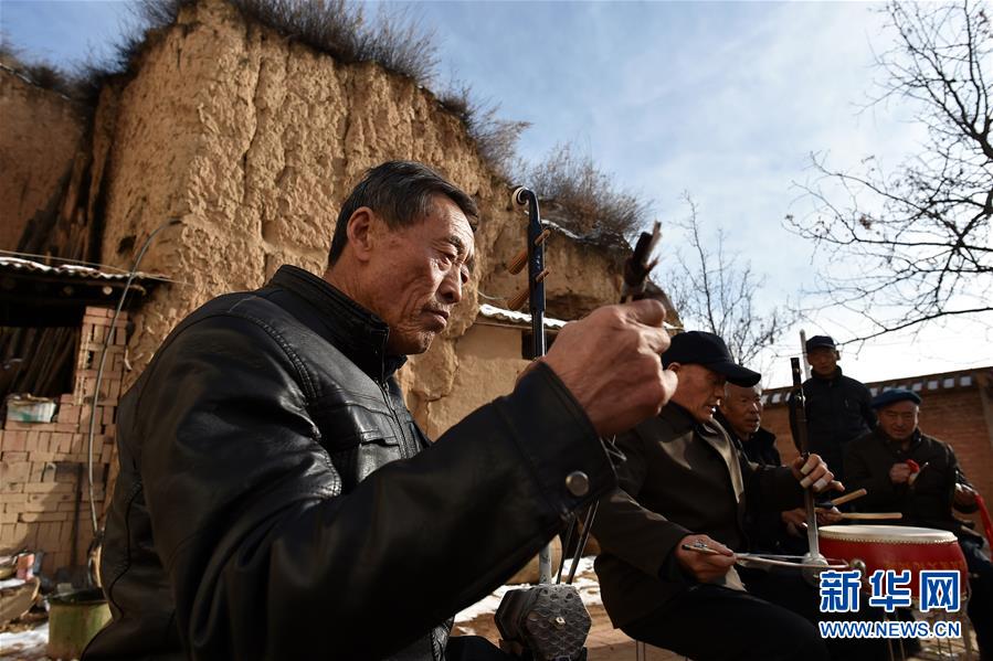 在武乡县大有乡王庄沟村,村民演奏乐器为秧歌队排练伴奏(2月15日摄)。 新华社记者 詹彦 摄