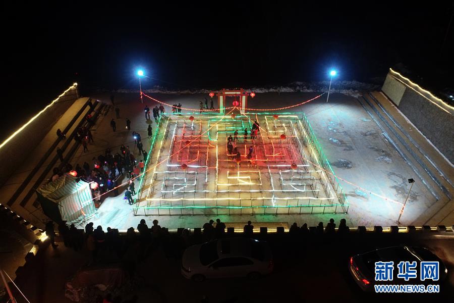 在武乡县大有乡王庄沟村广场上,村民们在九曲黄河灯阵中观灯(2月16日无人机拍摄)。 新华社记者 詹彦 摄