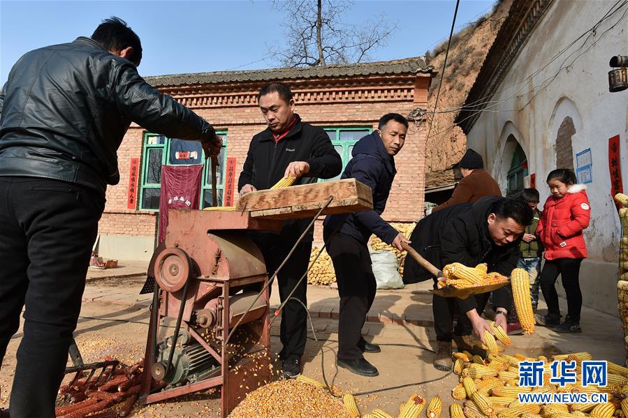 在武乡县大有乡王庄沟村,驻村第一书记靳建中(左二)和扶贫工作队队员徐乃勤(左三)、常建林(左四)在村民家里帮助村民给玉米脱粒(2月17日摄)。 新华社记者 詹彦 摄