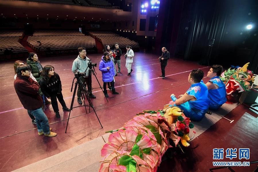 2月15日,中国舞协非遗传统舞蹈影像采集项目工作组在浙江省长兴县百叶龙大剧院采访长兴百叶龙艺术团的两名龙头演员。 新华社记者陈晔华摄