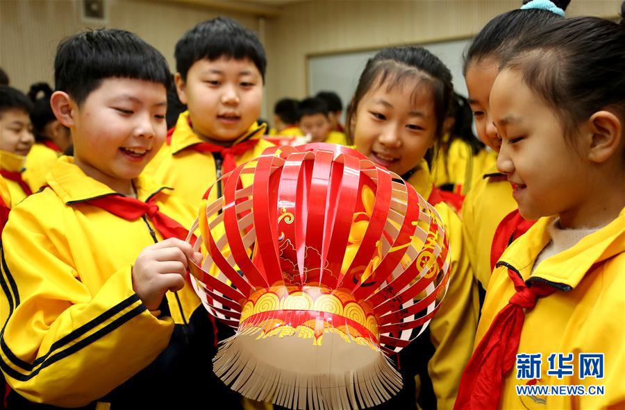 2月20日,山东省枣庄市光明路小学学生在展示用年货外包装制作的花灯。 新华社发(孙中喆 摄)