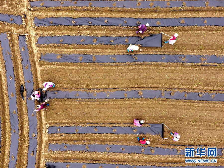 2月20日,在贵州省黔东南苗族侗族自治州榕江县忠诚镇安乐村,村民在田间覆盖地膜(无人机拍摄)。 新华社发(王炳真 摄)