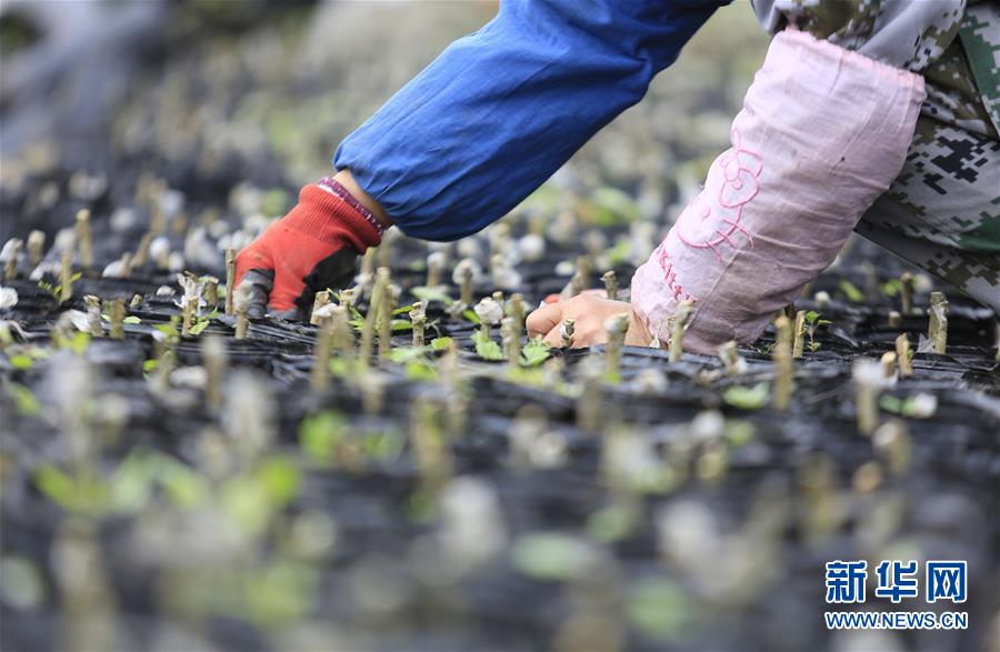 2月20日,在重庆北碚区澄江镇一家花果苗木公司的苗木基地,村民在检查苗木嫁接情况。 新华社发(秦廷富 摄)