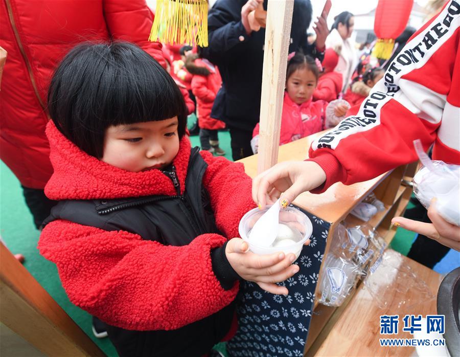 2月20日,一名小朋友在校园传统美食展示中品尝汤圆。 新华社记者 徐昱 摄