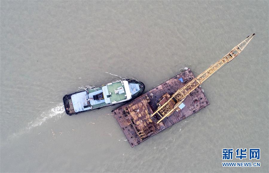 2月20日,在武汉长江、汉江核心区港口码头岸线资源优化调整启动仪式现场,执法艇将趸船拖离,前往船厂报废(无人机拍摄)。 新华社记者 熊琦 摄
