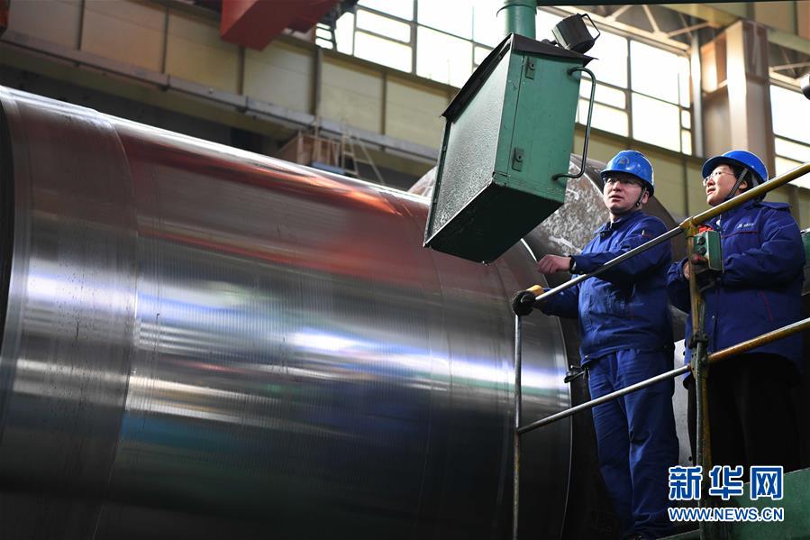 哈电集团哈尔滨电机厂有限责任公司副总设计师王波(右)在企业的水电分厂了解生产情况(2月12日摄)。新华社记者 王建威 摄