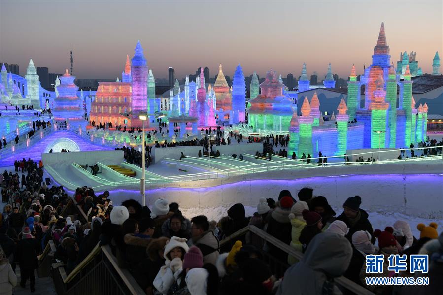 游客在哈尔滨冰雪大世界园区排队体验冰雪娱乐项目(1月5日摄)。新华社记者 王建威 摄