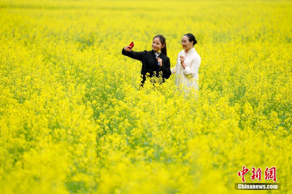 2月21日,游客在贵州万峰林油菜花田里自拍。近日,贵州省兴义市万峰林春意盎然,万亩油菜花竞相绽放,各地游客纷至沓来,前来赏花观景。中新社记者 贺俊怡 摄