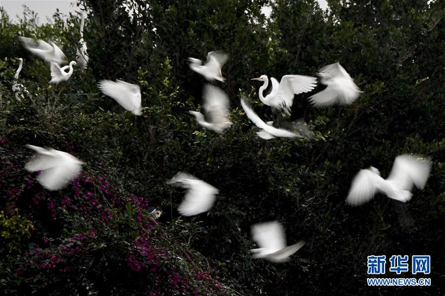 2月21日,福建省漳州市碧湖生态园内一群白鹭在树林内飞舞。 近日,福建省漳州市碧湖生态园内鸟语花香,春意盎然。 新华社记者 姜克红 摄
